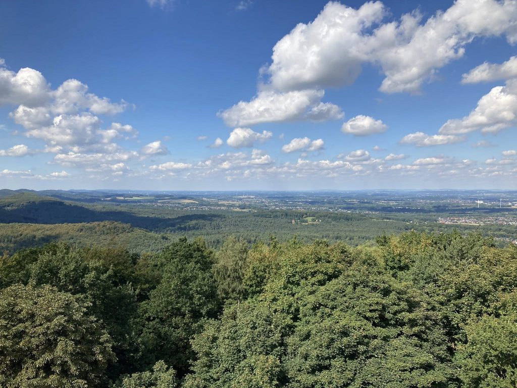Der Rundgang führte auch über das Gelände einer ehemaligen Fluchtburg aus der Vorzeit. Besonders eindrucksvoll: die Sichtachse von alten Sandstein-Arbeitstischen auf die gigantische Statue. Krönender Abschluss war der Aufstieg zum Umlaufbereich des Sockels. Bei strahlendem Spätsommerwetter genoss die Dülmener Gruppe von dort einen Panorama-Blick über den Teutoburger Wald und das Eggegebirge.